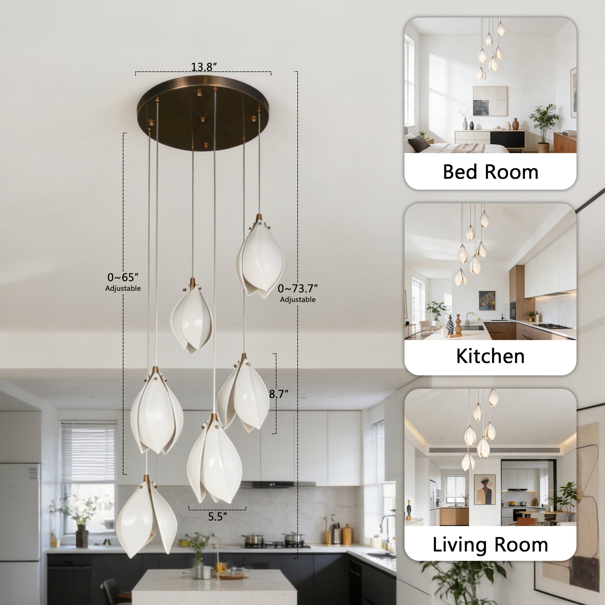 - Premium Ceramic & Metal Construction: Built with high-quality ceramic (for the white petal shades) and durable metal (for the gold base and suspension wires), the fixture balances sturdiness and lightweight design. The white ceramic surface is scratch-resistant and heat-tolerant, retaining its soft, matte luster for years, while the gold metal components resist rust and tarnish.
