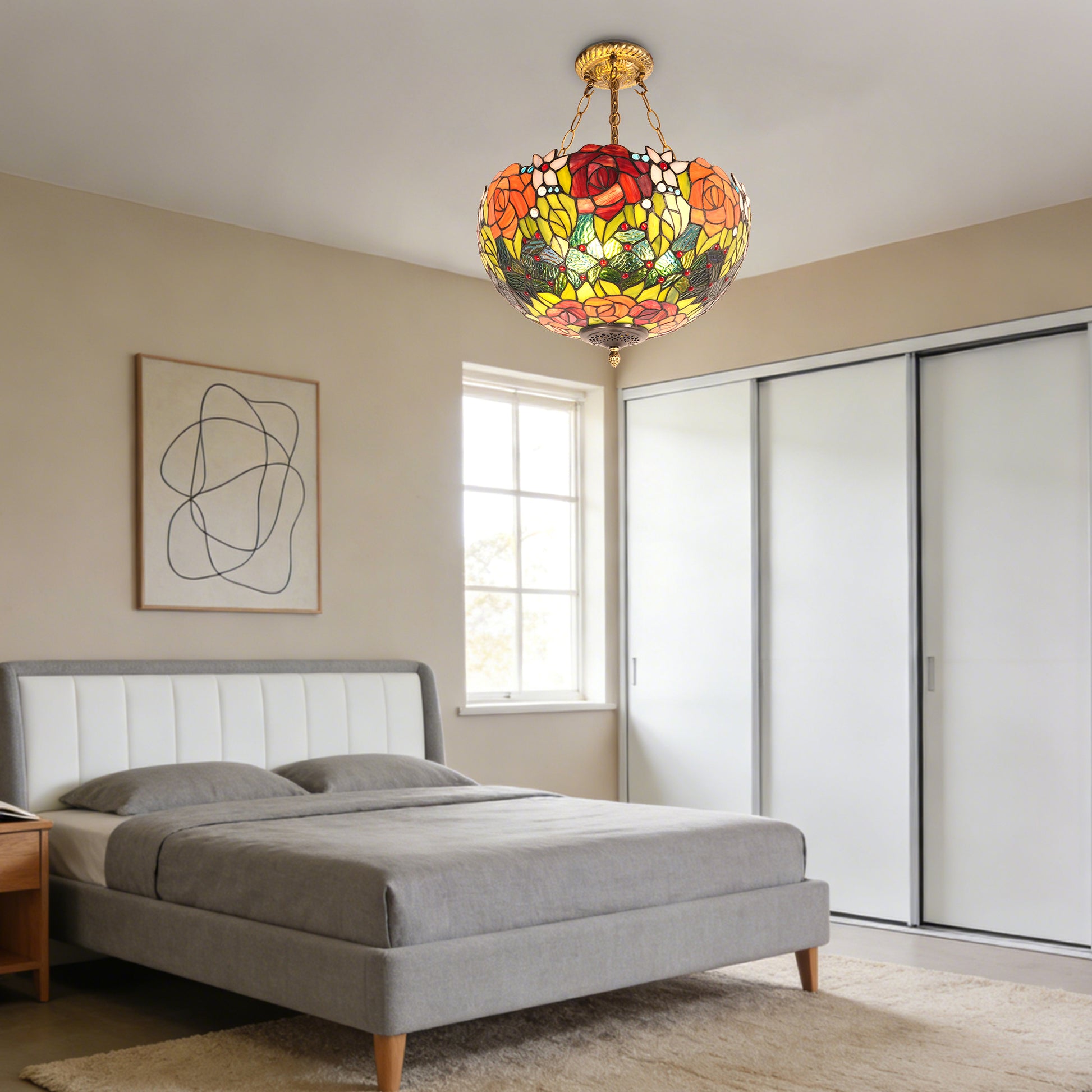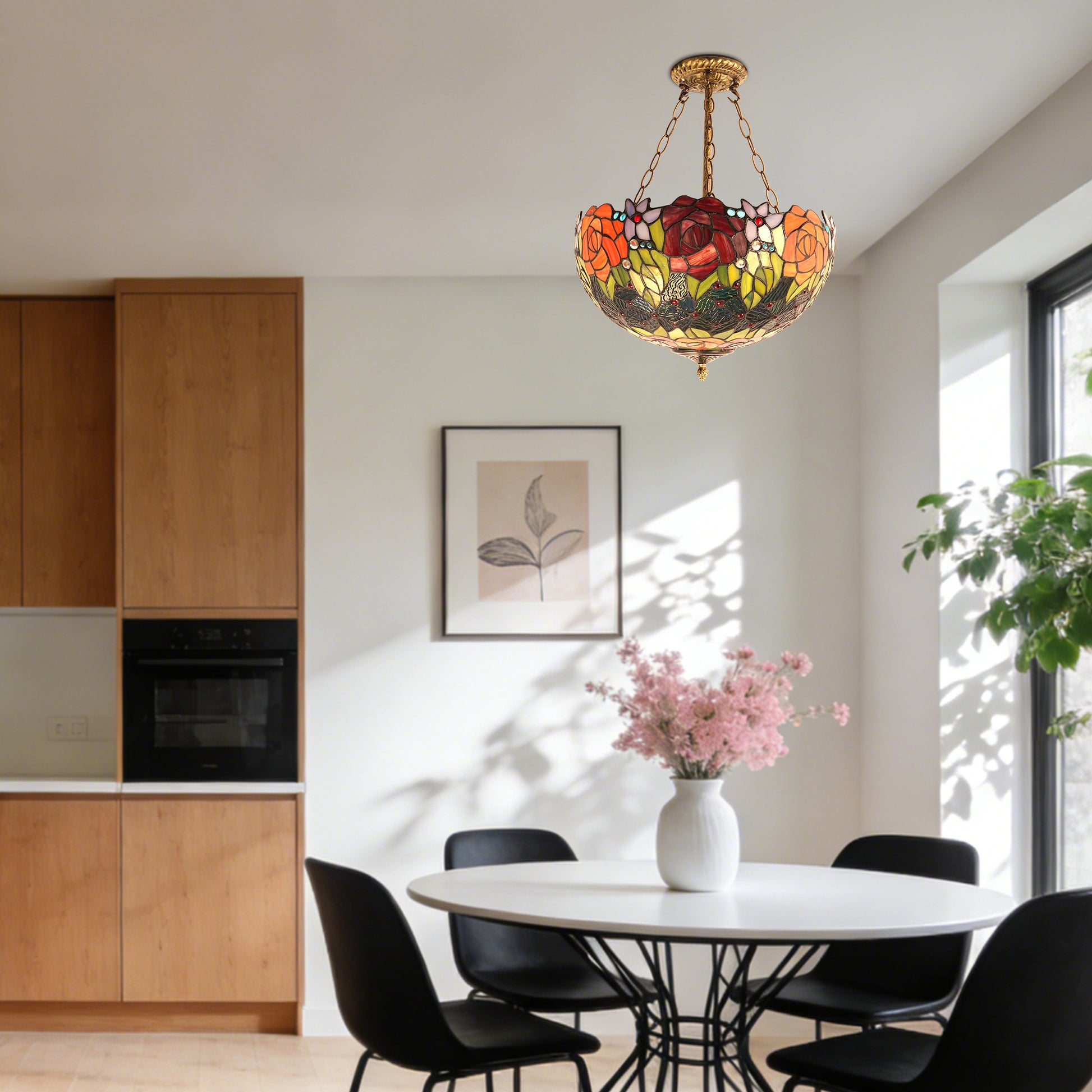 Elevate your home with the romantic, timeless charm of our Tiffany Style Rose Stained Glass Semi-Flush Mount Chandelier. This exquisite fixture features a handcrafted stained glass shade, adorned with a lush pattern of vibrant red and orange roses set against a backdrop of rich green leaves, framed by an elegant gold metal frame and chains, creating a luminous focal point that evokes the iconic craftsmanship of Tiffany glasswork.