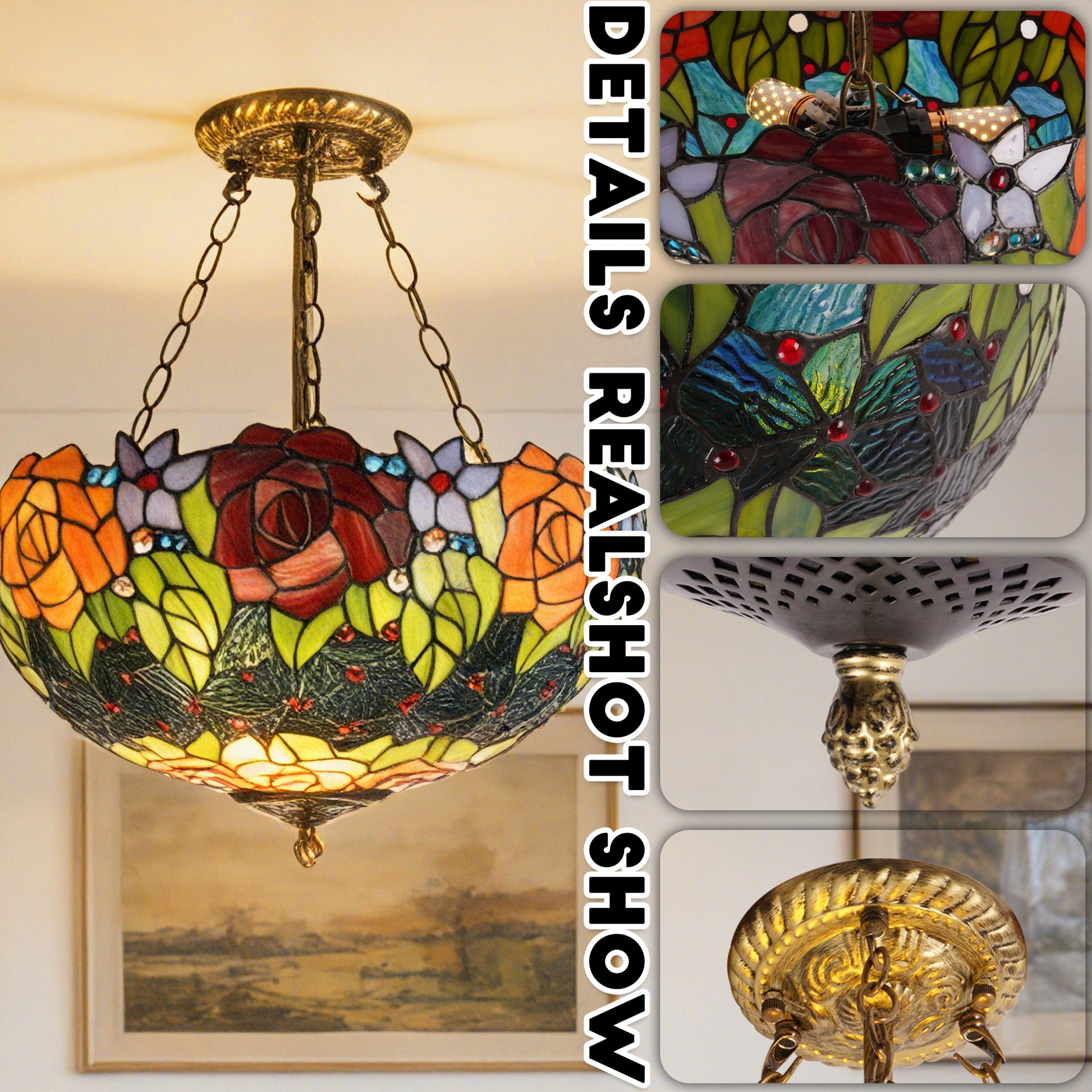 Transform any room into a space of timeless beauty and warm illumination with our Tiffany Style Rose Stained Glass Semi-Flush Mount Chandelier. Whether you’re looking to make a bold statement in your living room or add a touch of romantic charm to your bedroom, this fixture is sure to captivate and delight.