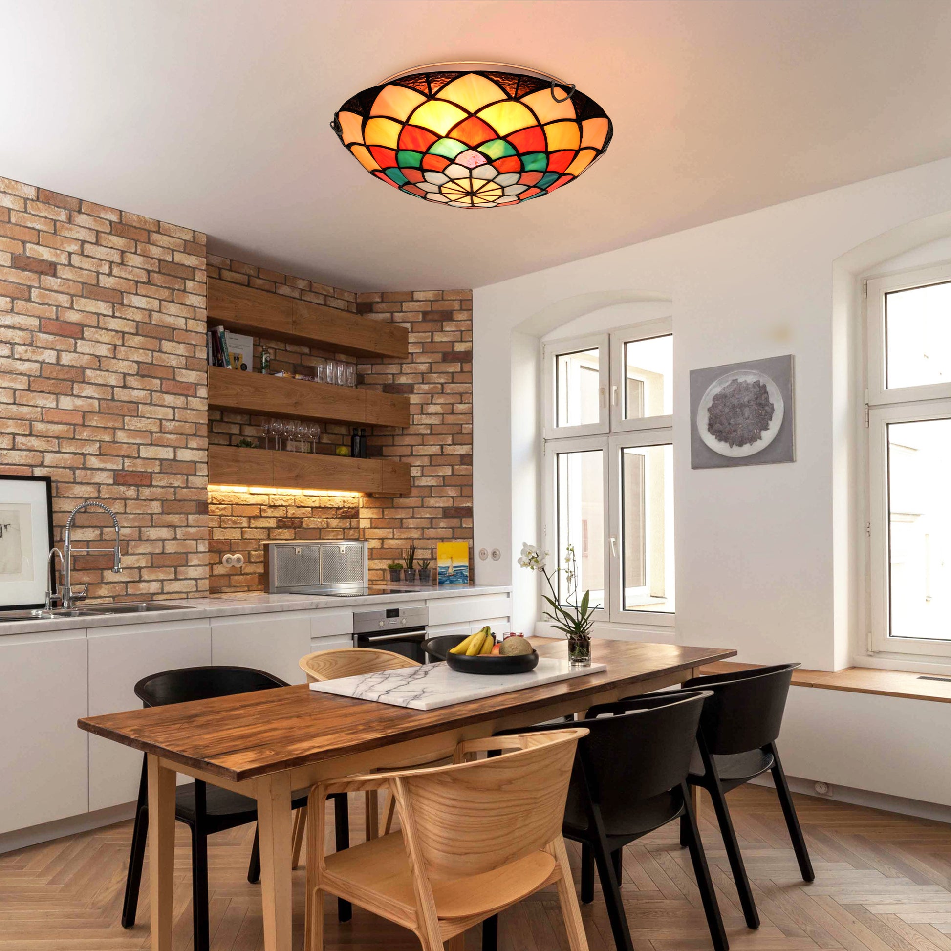 This ceiling light features vibrant, colorful glass pieces arranged in a detailed pattern, adding a touch of elegance and sophistication to any room.