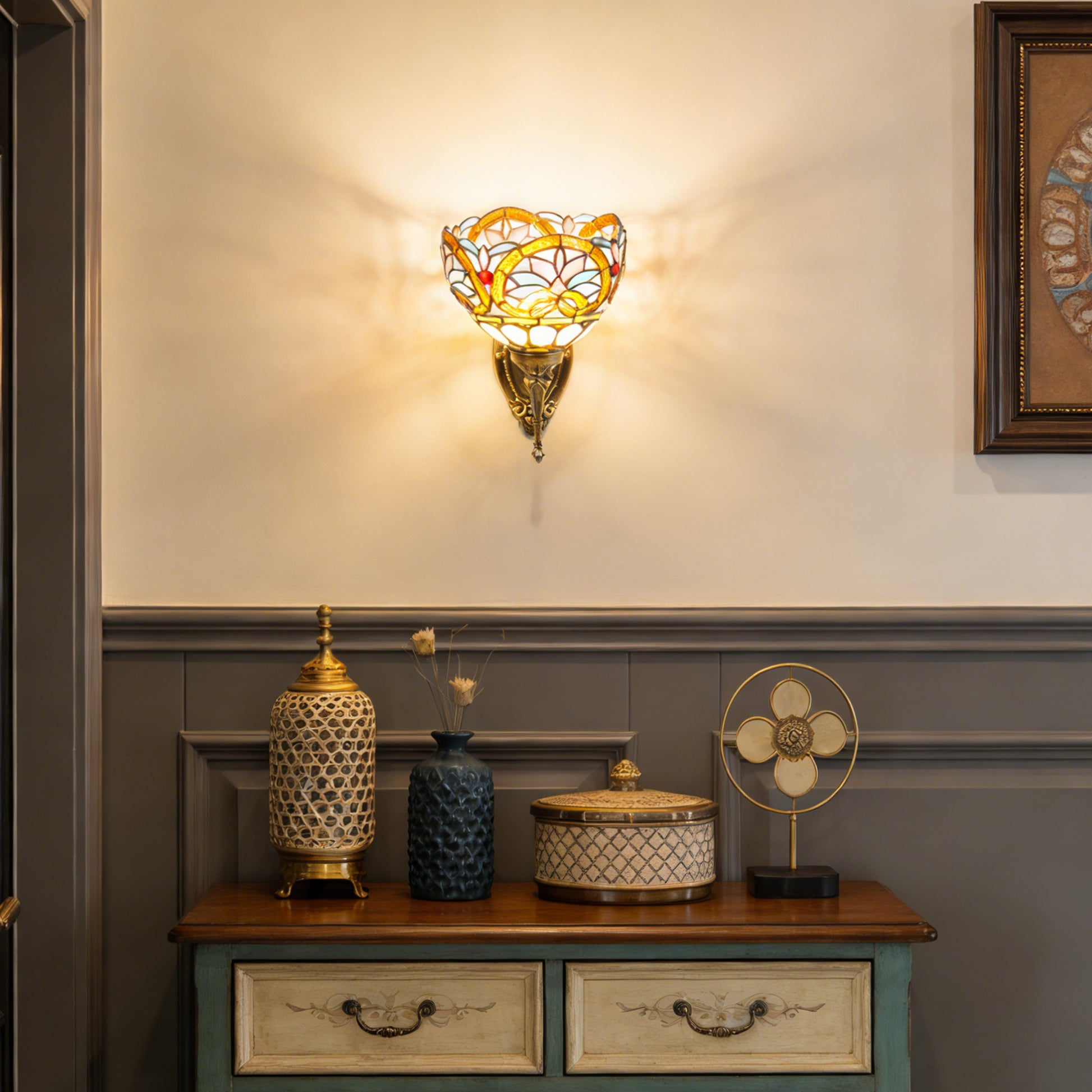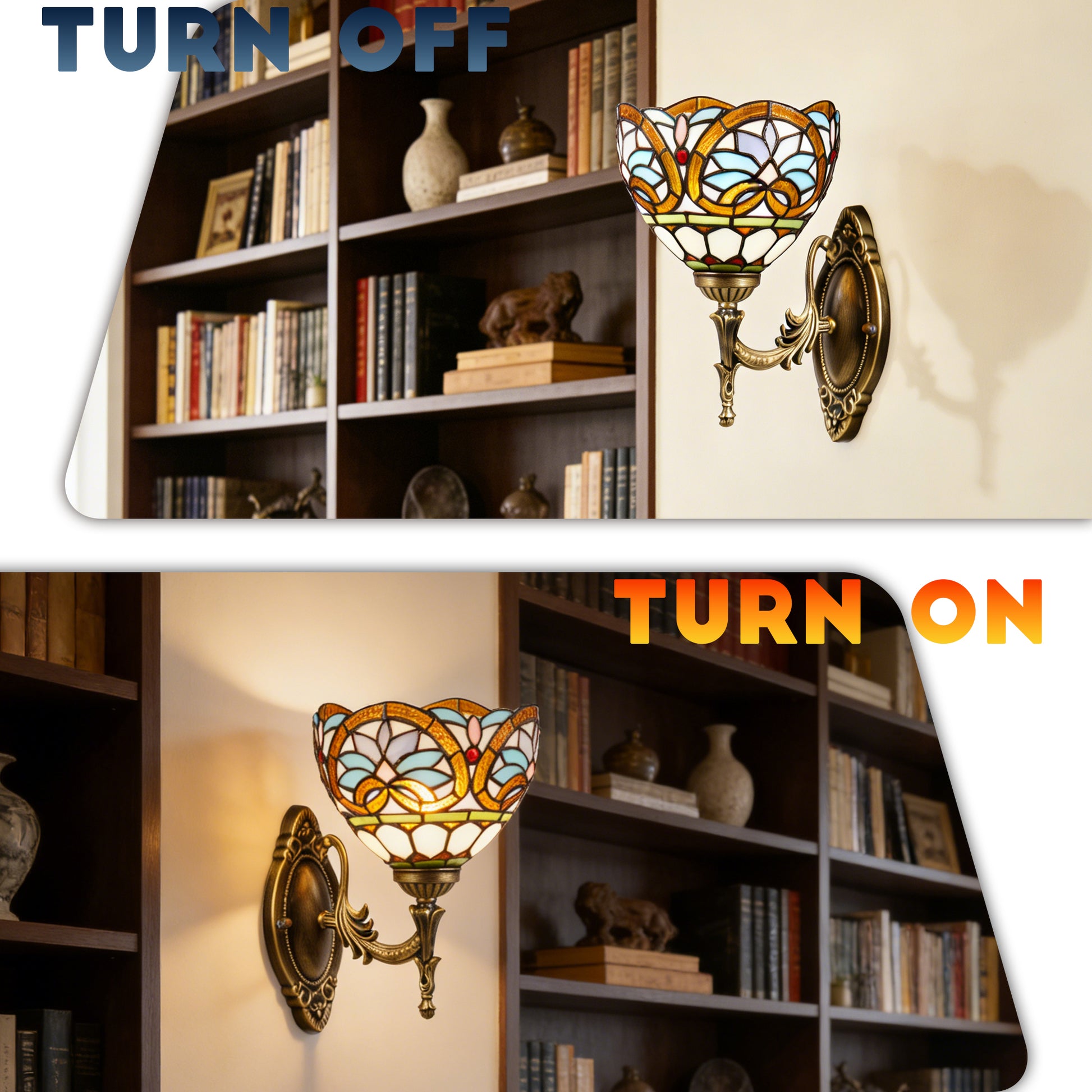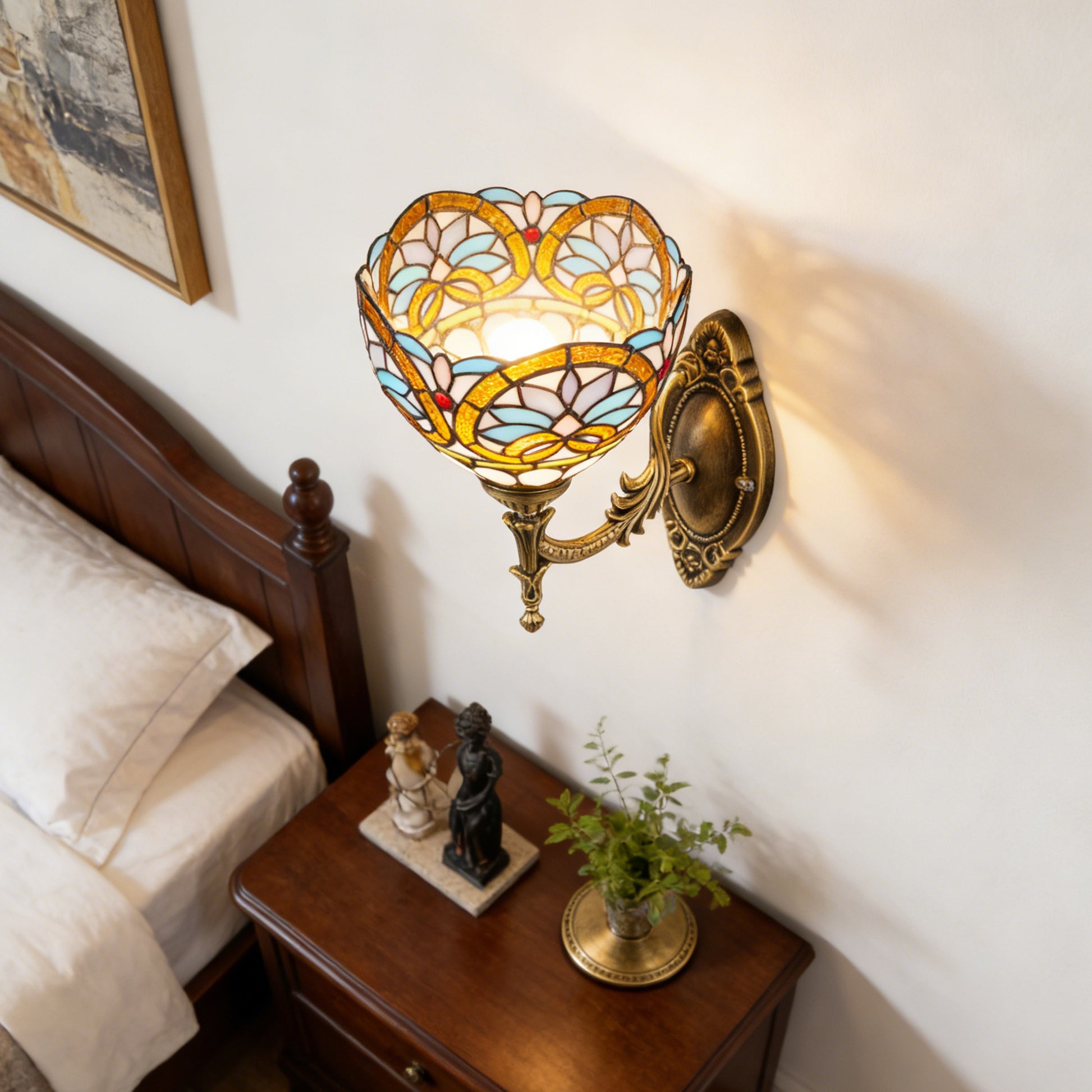 Immerse your space in the timeless artistry of Tiffany glass with our Tiffany Style Stained Glass Wall Sconce. This ornate fixture features a handcrafted multicolor stained glass shade, paired with an intricately carved antique bronze metal frame, creating a warm, nostalgic glow that transforms any wall into a decorative masterpiece.