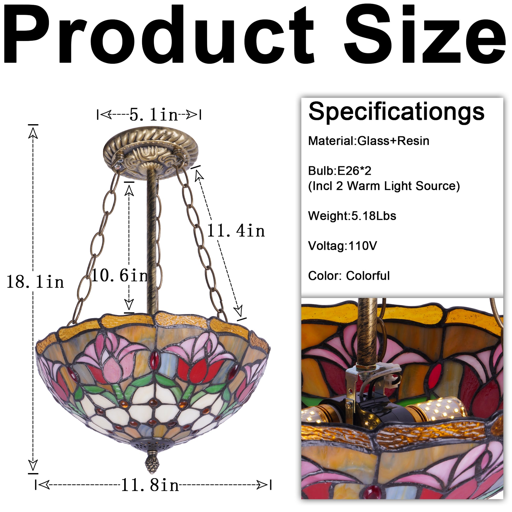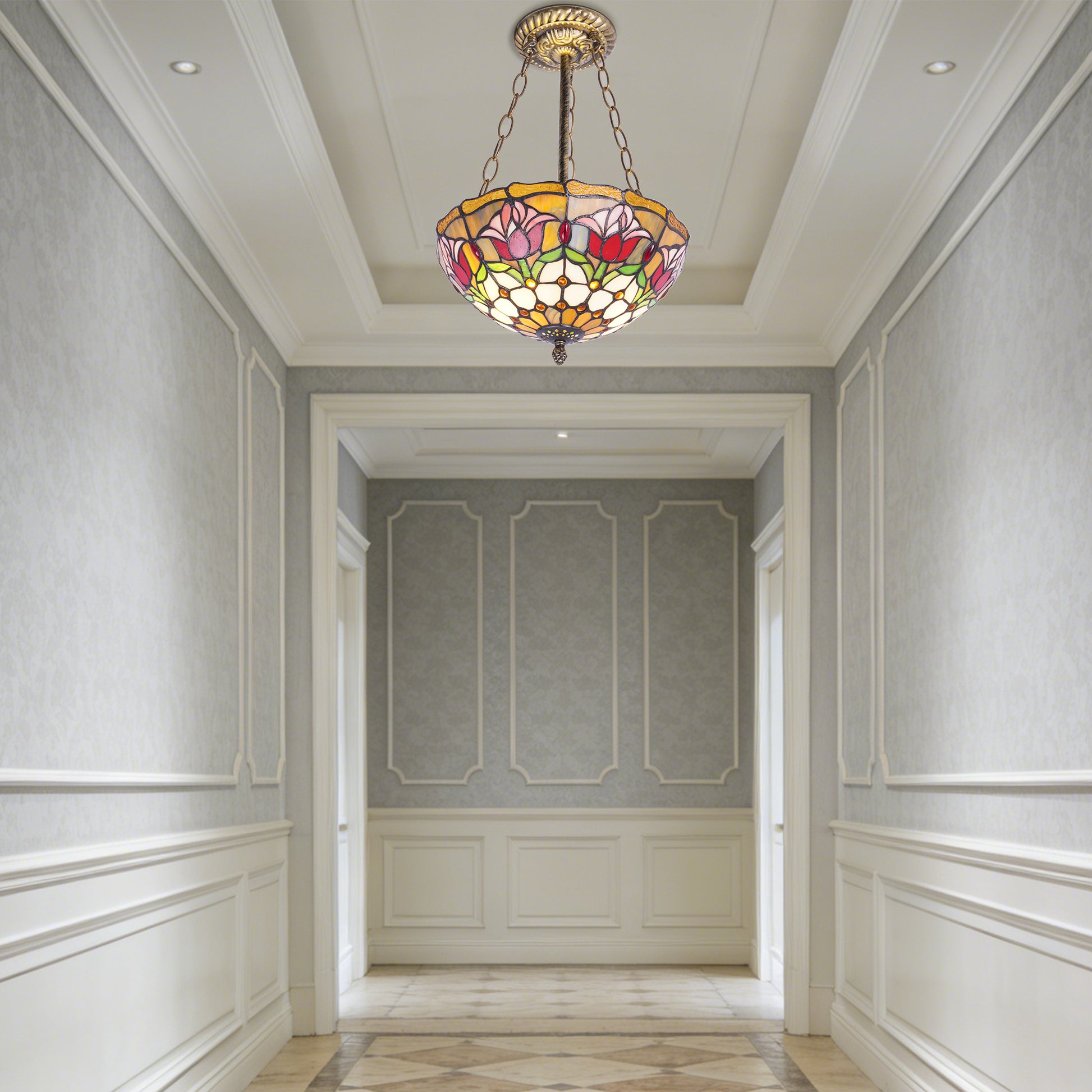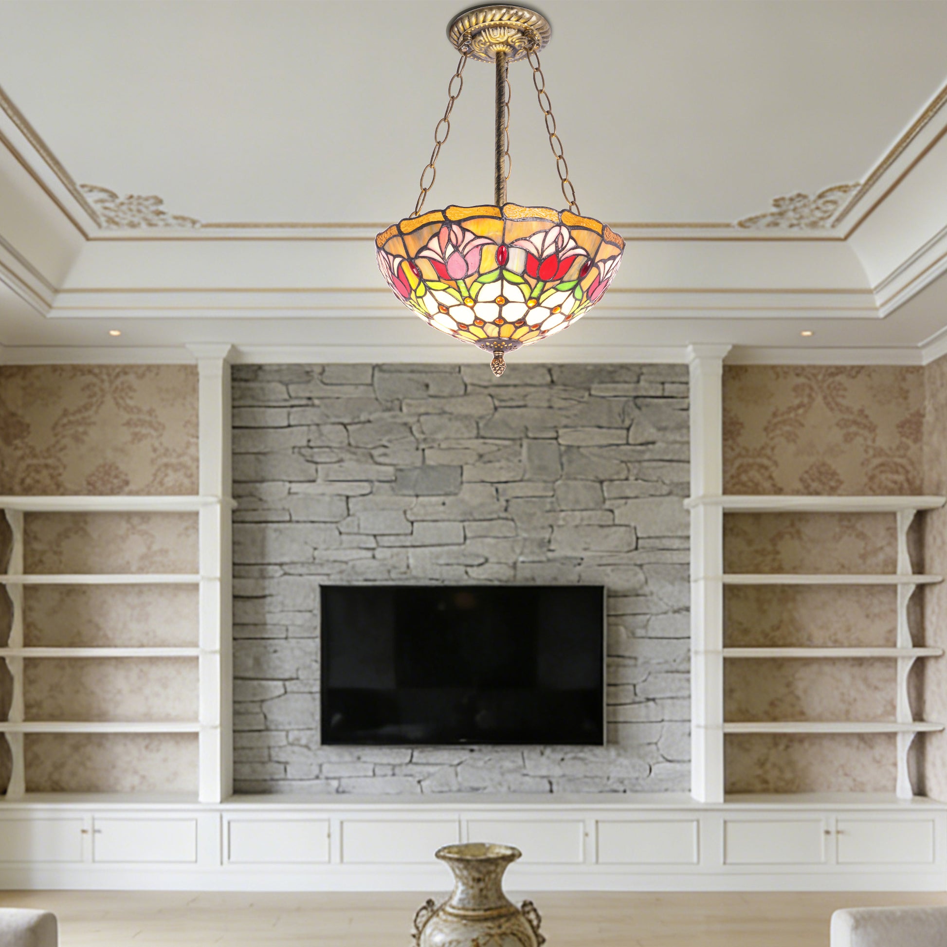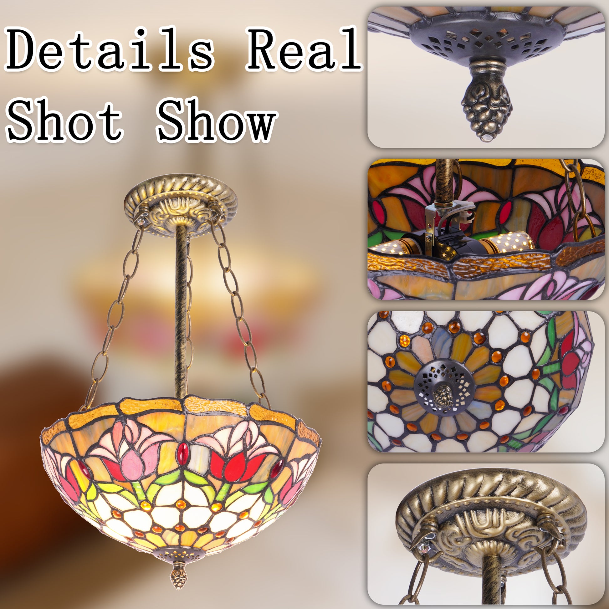 Vintage Gold Hardware: The fixture is suspended by ornate metal chains and a decorative ceiling plate, finished in a rich antique gold that complements the stained glass perfectly. The semi-flush mount design allows for a sleek, low-profile installation, making it suitable for rooms with standard or low ceilings.
