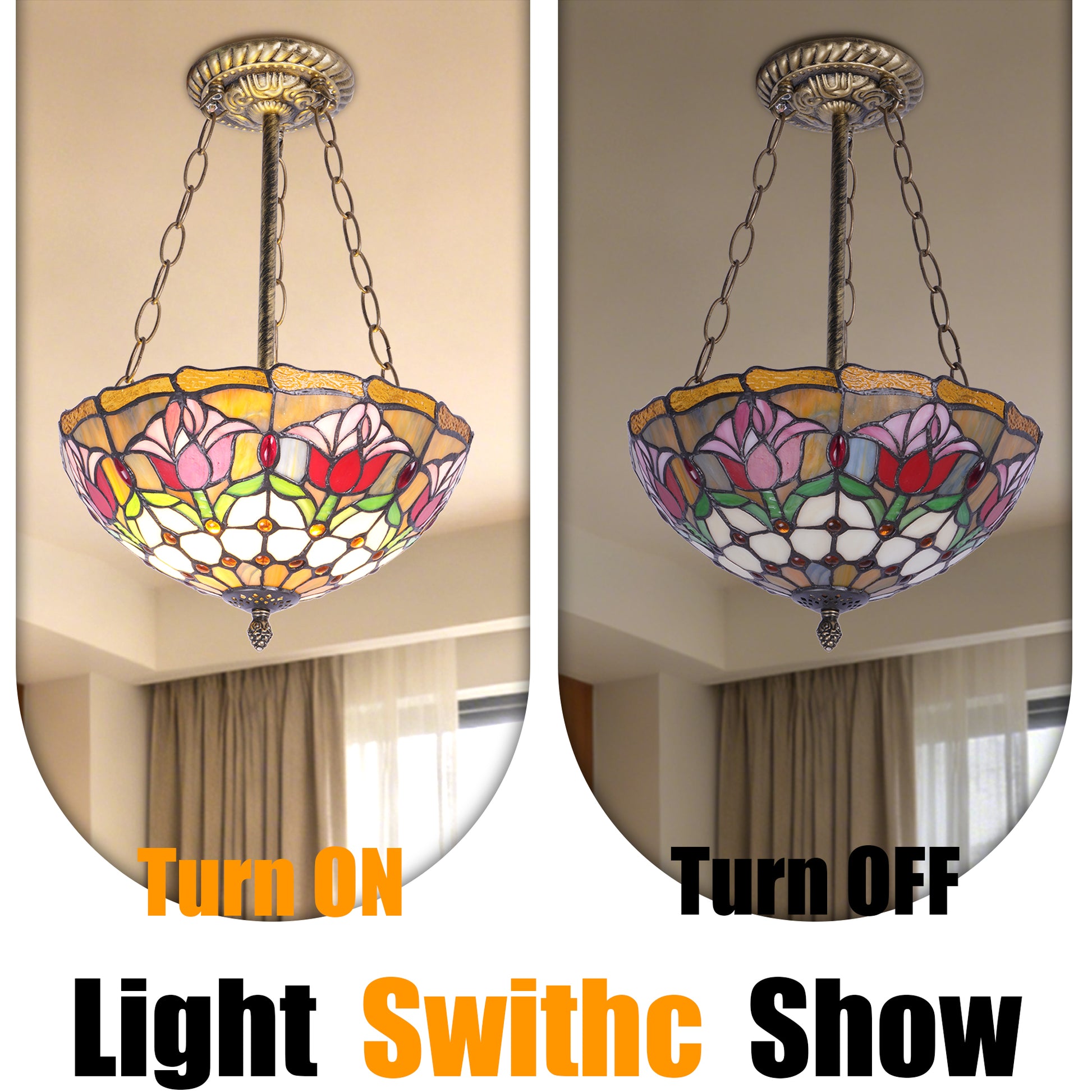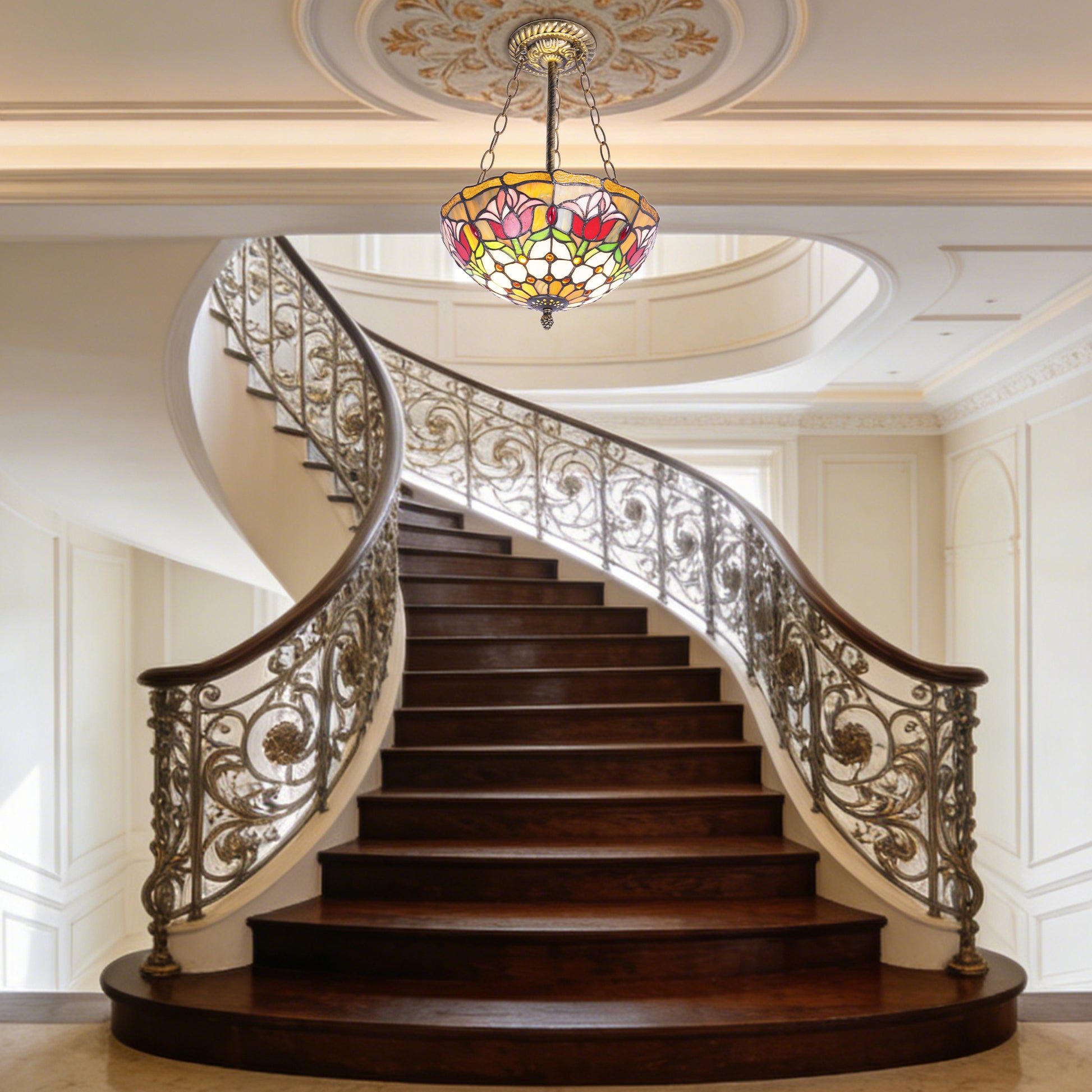 Transform any room into a space of timeless beauty and warm illumination with our Tiffany Style Tulip Stained Glass Semi-Flush Mount Chandelier. Whether you’re looking to make a bold statement in your living room or add a touch of romantic charm to your bedroom, this fixture is sure to captivate and delight.