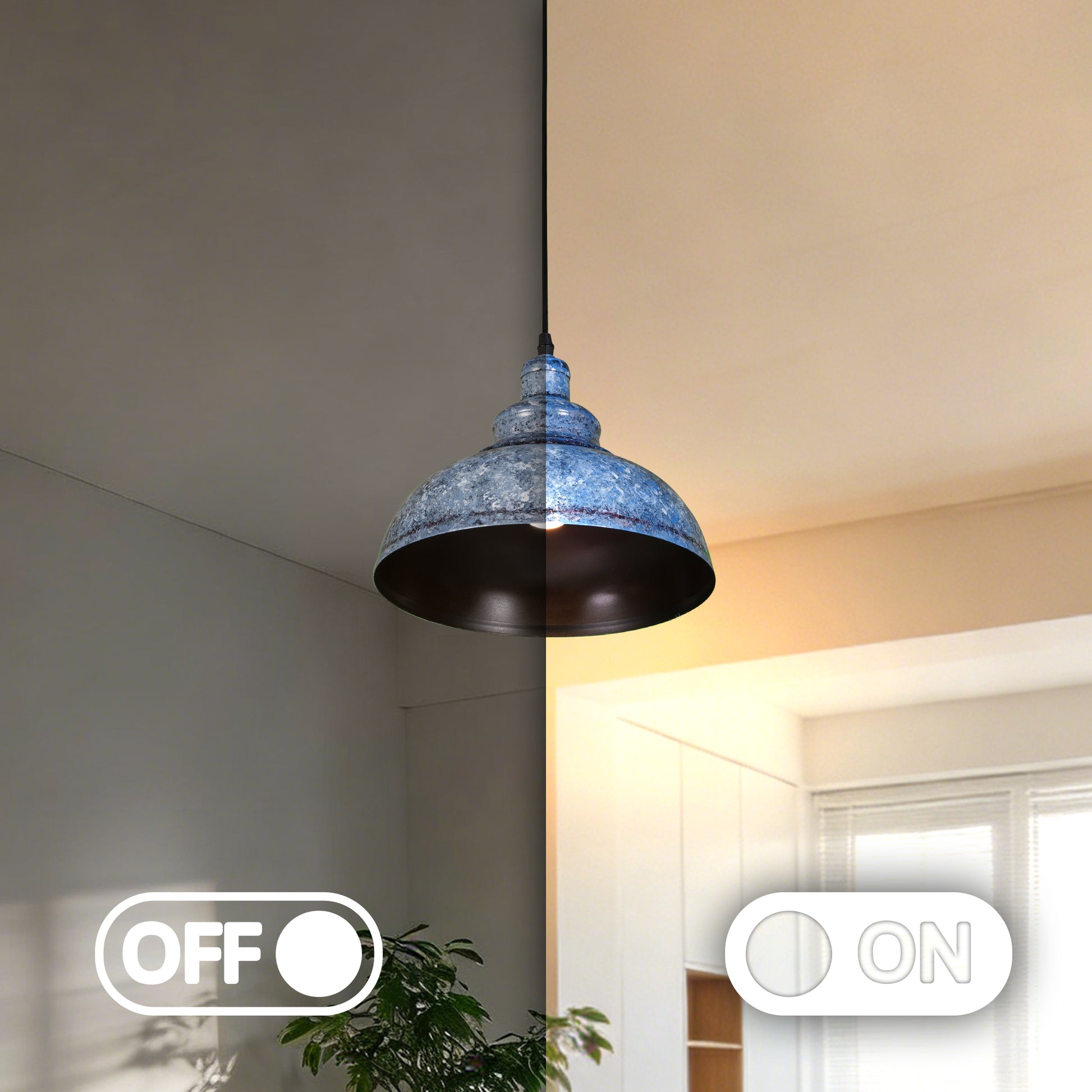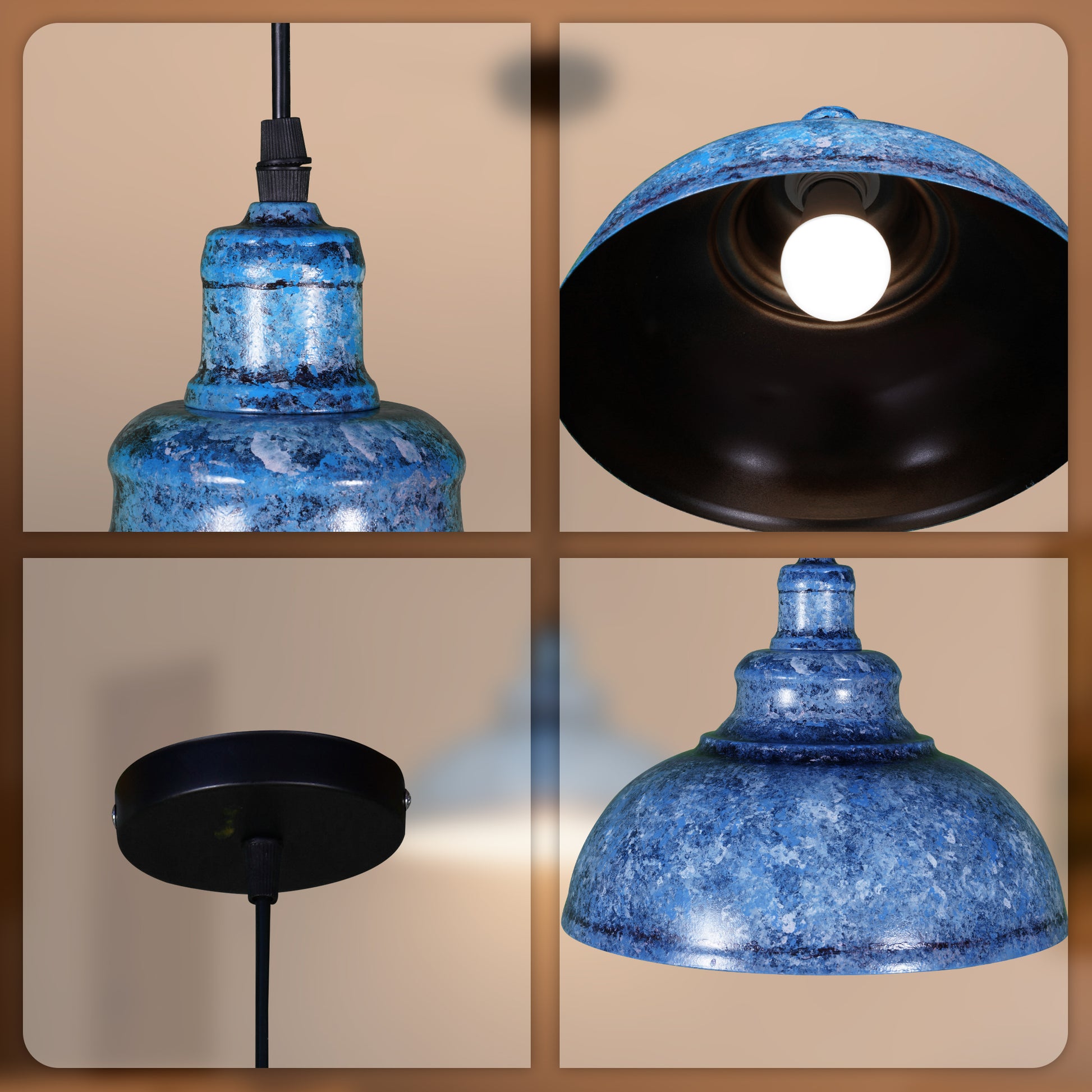 - Distressed Blue Industrial Design: The pendant light features a classic dome-shaped shade with a unique hand-applied blue distressed finish (mottled blue with subtle dark undertones), paired with a smooth matte black interior that enhances light reflection. The tiered neck detail adds vintage mechanical flair, making each fixture slightly unique in its finish.