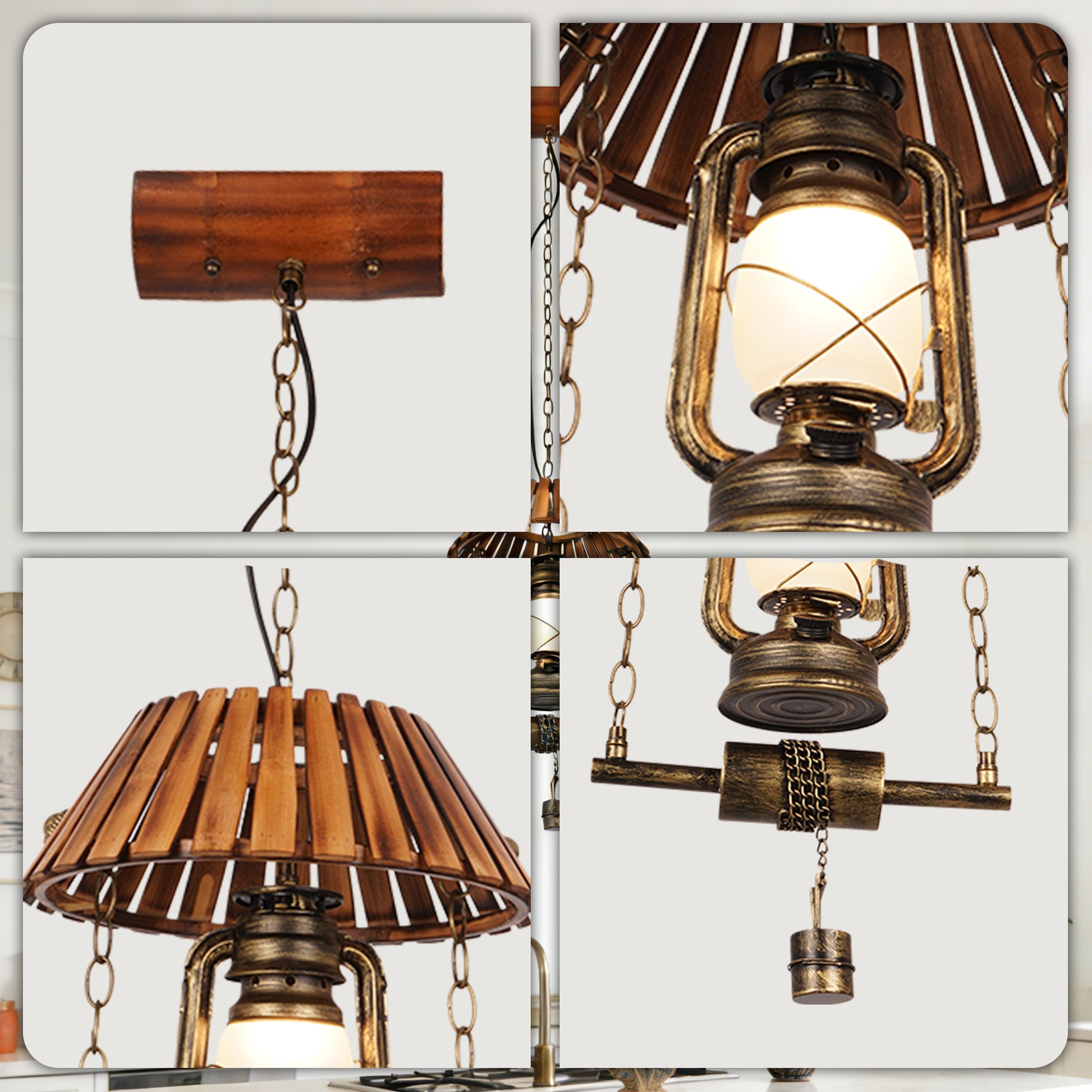 - Iconic Retro Kerosene Lamp Design: The pendant features a classic domed wooden slatted canopy (evoking coastal/rustic texture) and a detailed replica kerosene lantern with frosted glass and cross-strap detailing. The antique bronze iron frame and hanging chains add vintage mechanical flair, making it a striking focal point in any room.